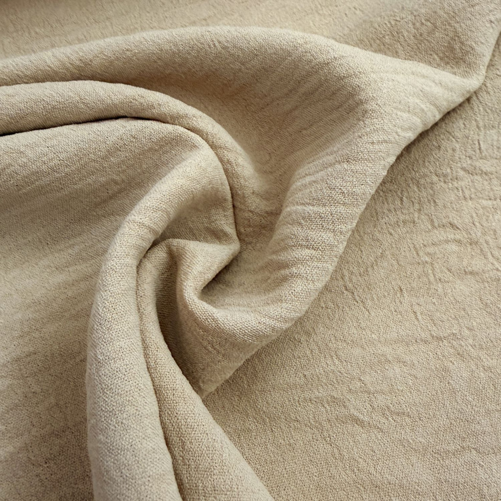 A Bézs American crepe egy modern, sokoldalú ruházati textil, amely finoman kreppelt felületével és lágy esésével elegáns megjelenést biztosít.