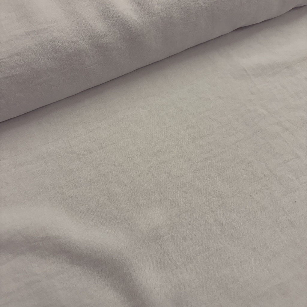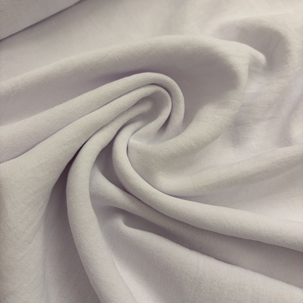 A Fehér American crepe anyag könnyed esésű, enyhén rugalmas és elegáns megjelenésű textil, amely ideális ruházati felhasználásra.