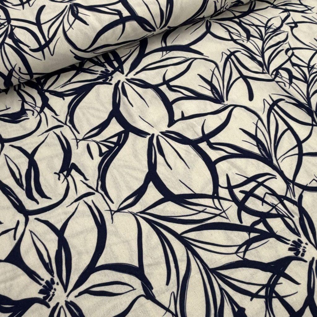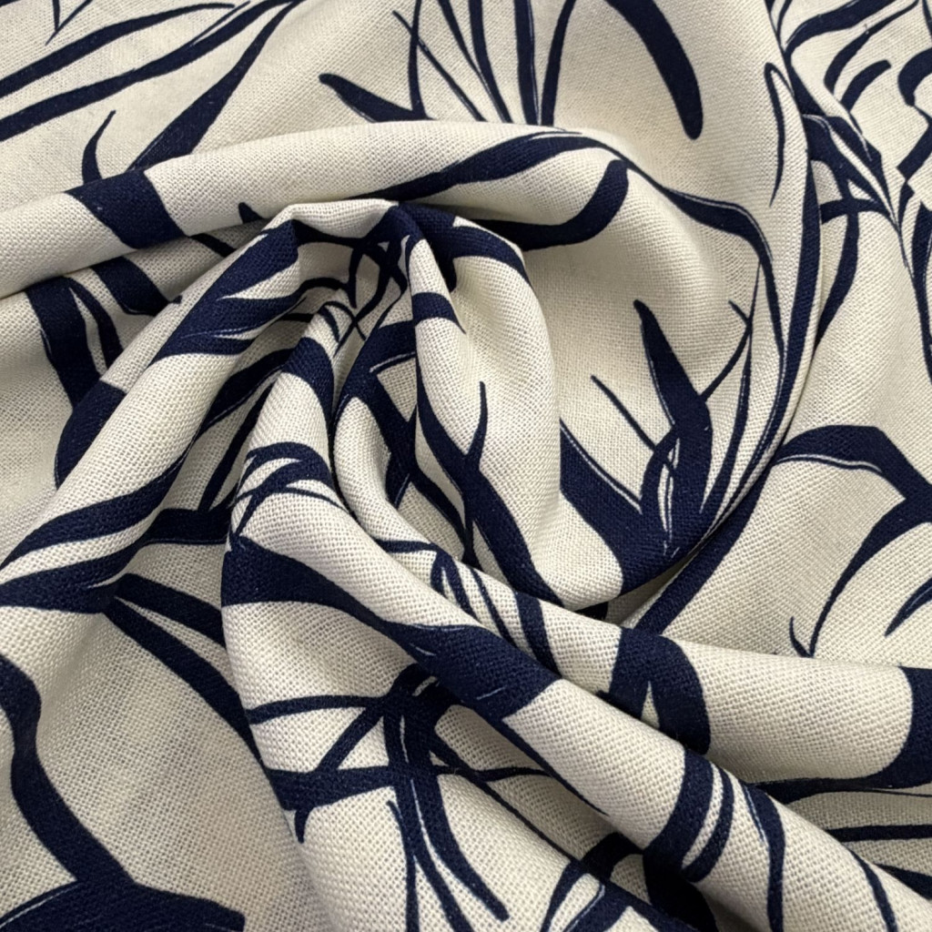 A kék nagyvirágos lenhatású anyag tökéletes választás, ha könnyű, nyárias és természetes hatású textilt keresel, amely látványos mintájával különleges megjelenést biztosít.