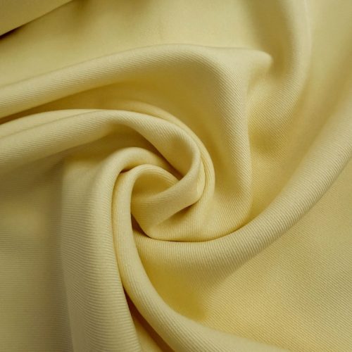A PASZTELL SÁRGA Latina (Light Barbie) anyag könnyű, lágy esésű és enyhén rugalmas ruházati textil, amely ideális nyári ruhákhoz és kényelmes viselethez.