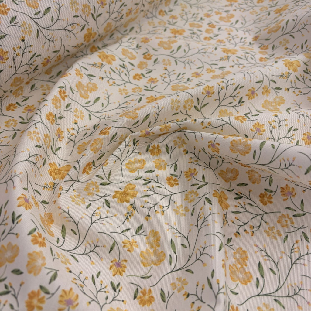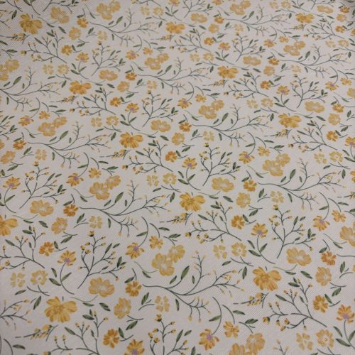 A sárga virágos impregnált vászon egy vidám, napfényes hangulatú, vízlepergető felületű anyag, amely tökéletes választás terítők, táskák és dekorációk készítéséhez.