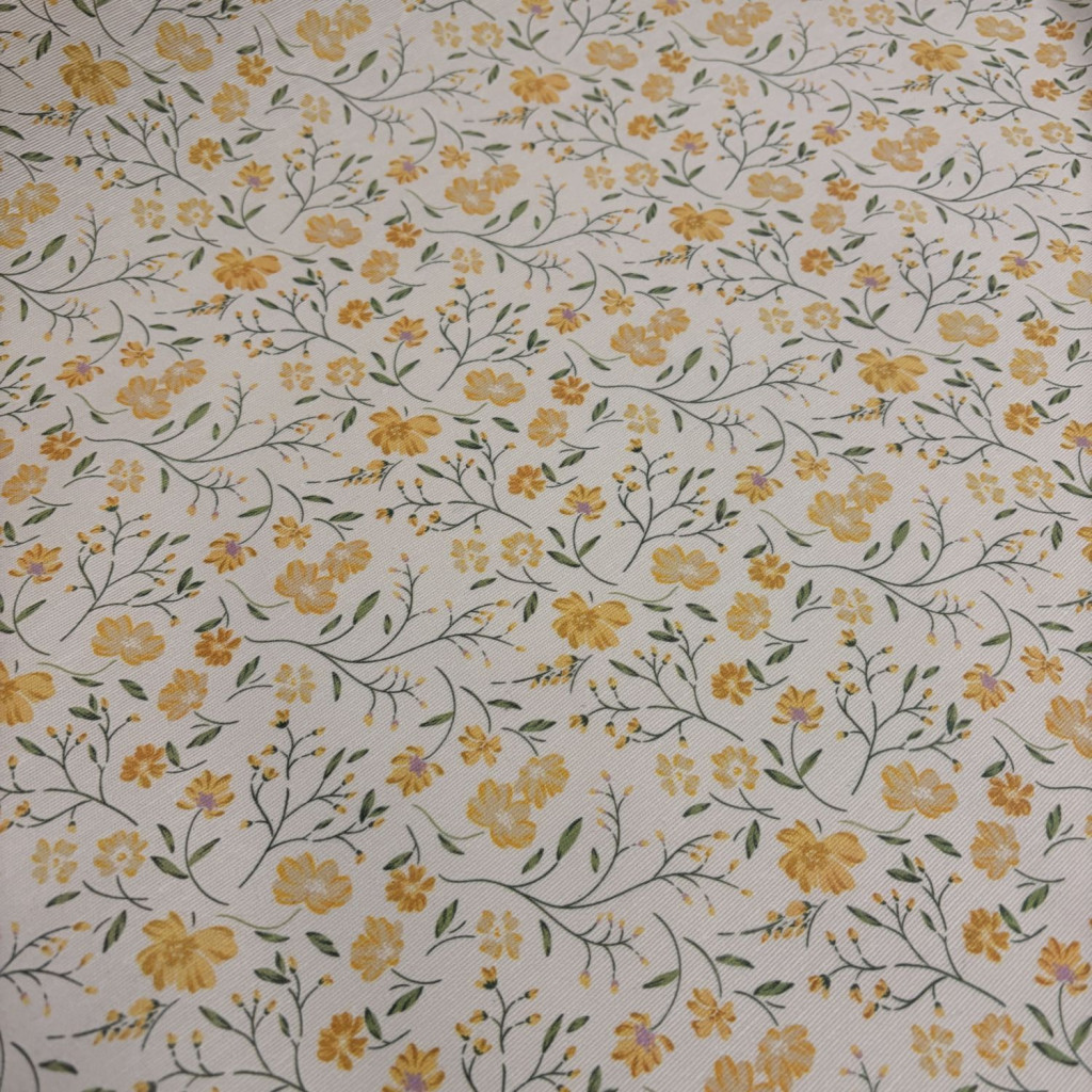A sárga virágos impregnált vászon egy igazán hangulatos, praktikus textil, amely a napfényes sárga virágmintákat és a vízlepergető felület előnyeit ötvözi. Ez az anyag tökéletes választás, ha egyszerre szeretnél szép és könnyen kezelhető textileket.