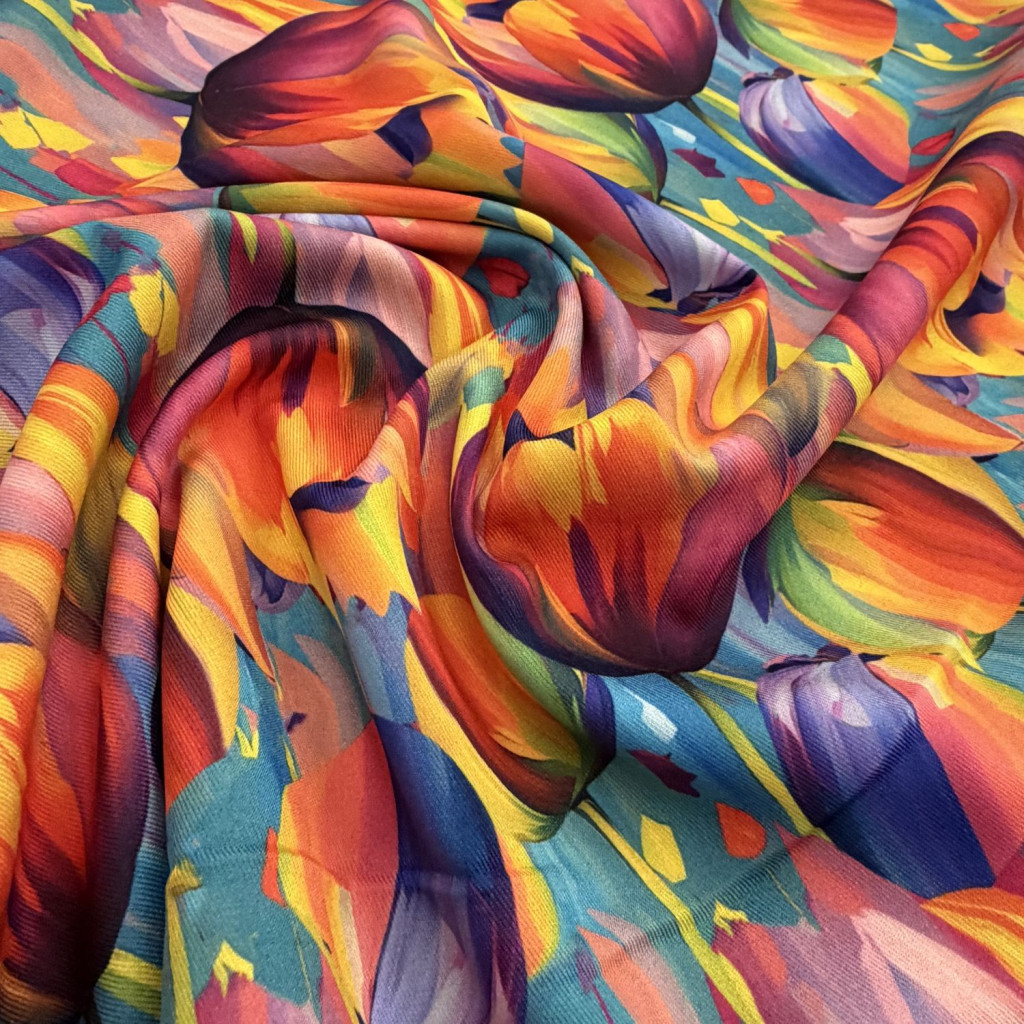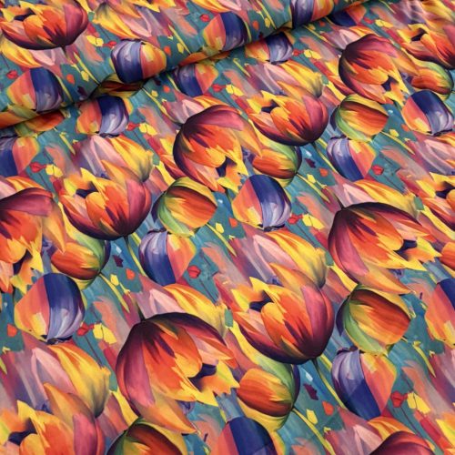 A színes tulipán mintás Latina anyag tökéletes választás, ha könnyű, szép esésű és nőies ruházati textilt keresel tavaszi vagy nyári ruhákhoz.
