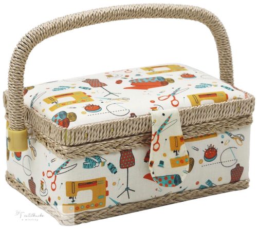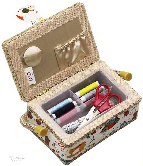 A belsejében van egy tűpárna és zseb. Van hozzá egy műanyag tároló 3 rekesszel, amelyekben varróeszközöket lehet tárolni. Könnyen kivehető. A kosár mágnessel kapcsolódik, erős füle is van.