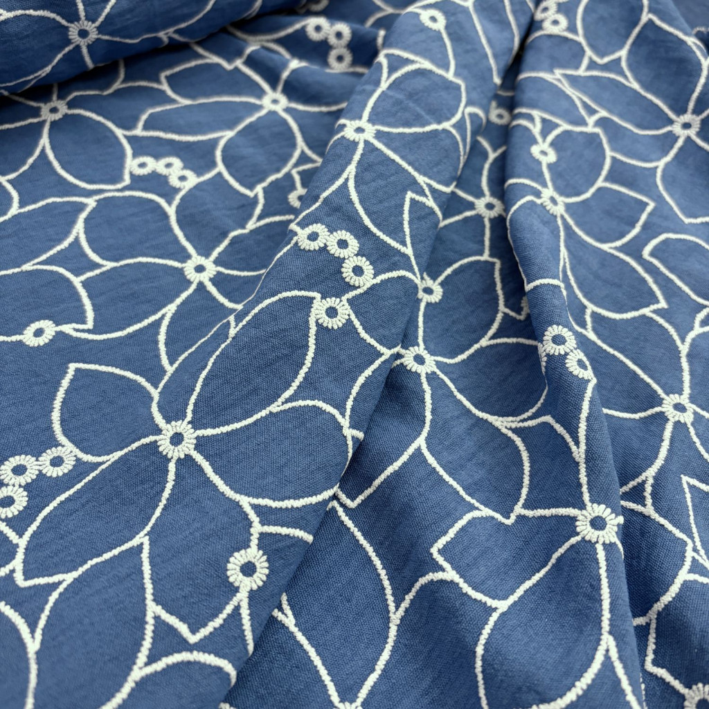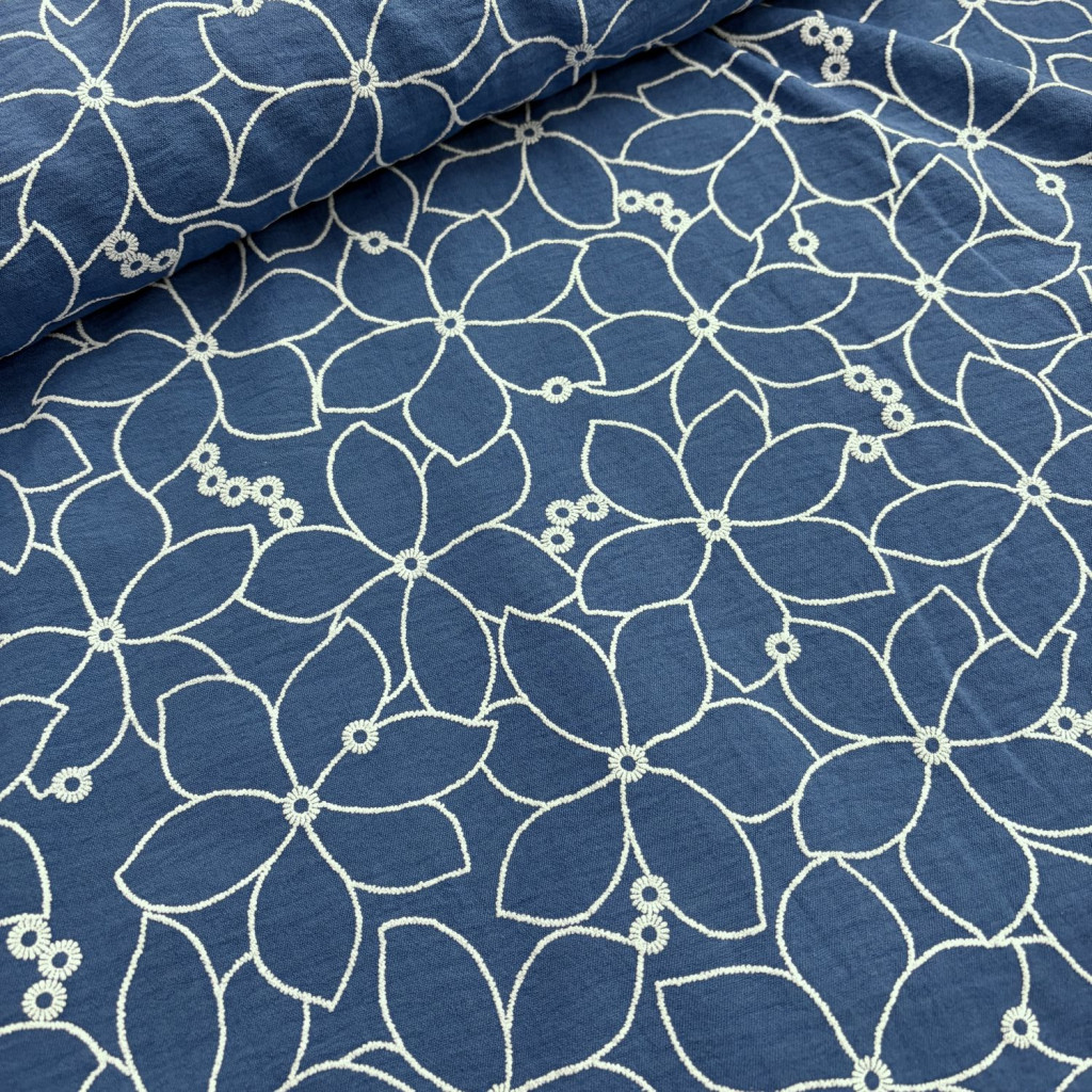 A virágmintás Farmerkék American crepe anyag elegáns esésű, könnyű ruházati textil, amely különleges, szövött hatású mintájával tűnik ki.