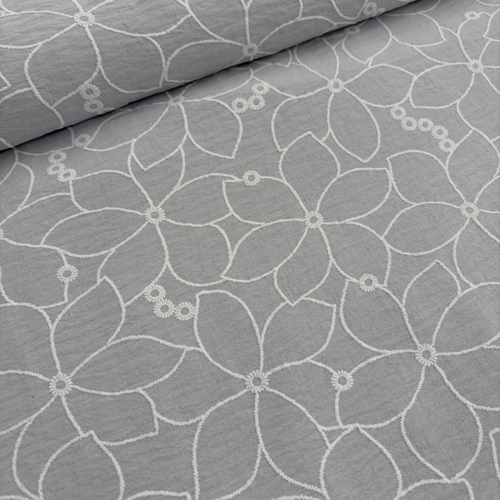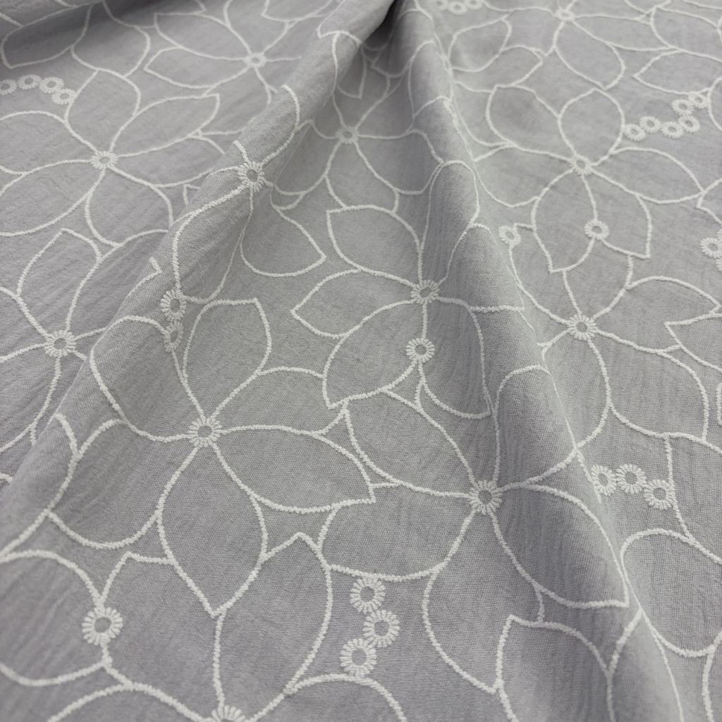 A virágmintás Szürke American crepe anyag elegáns esésű, könnyű ruházati textil, amely különleges, szövött hatású mintájával tűnik ki.