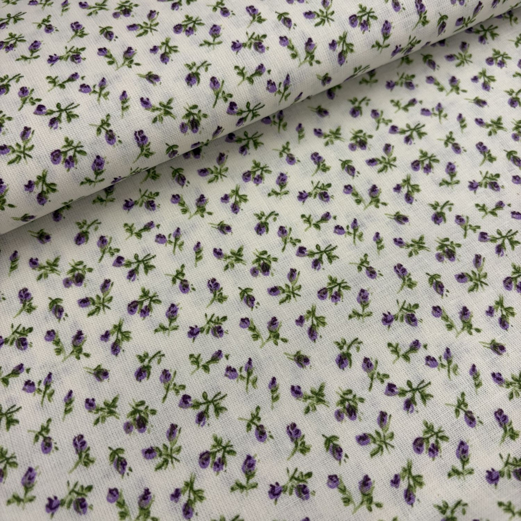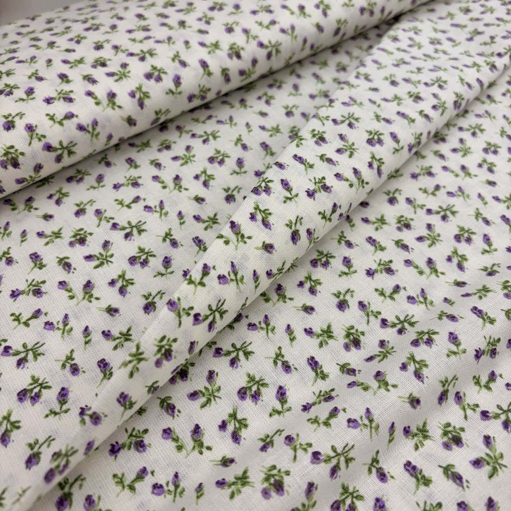 A lila kis virágos pamutvászon egy 100% pamutból készült, természetes alapanyagú textil, amely finom, apró virágmintájával romantikus és vidám hangulatot teremt.